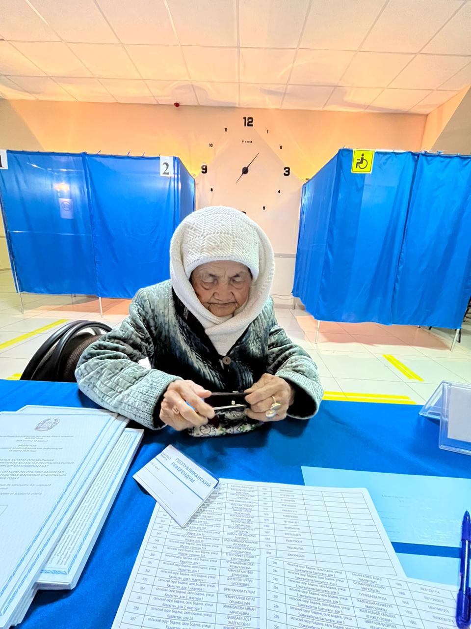 Солардың бірі – 87 жастағы ауыл тұрғыны Буралиева Жанымсия апа. Қария референдум учаскесіне ерте келіп, алғашқылардың бірі болып өз таңдауын жасады.