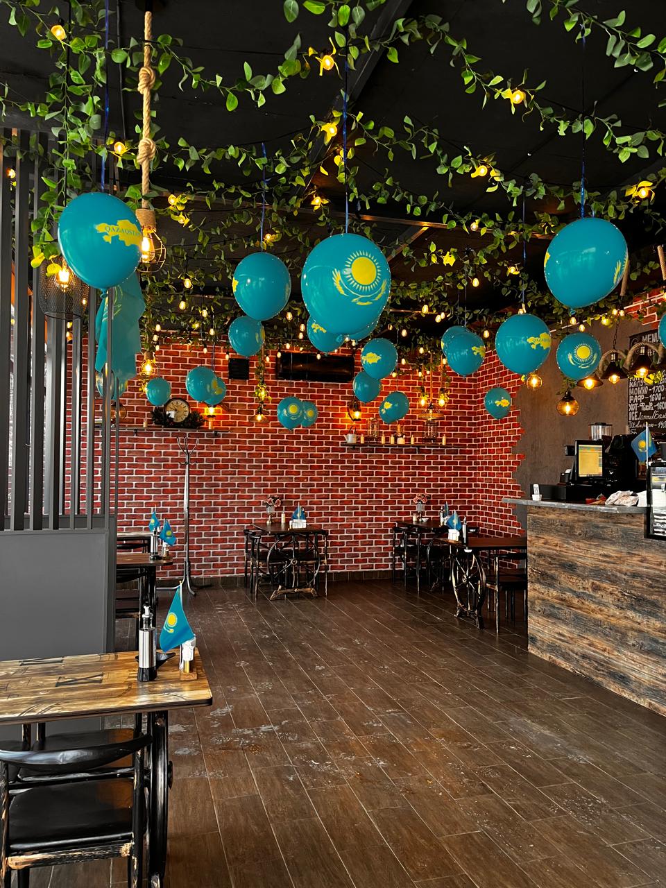 Кафеде әр үстелге Қазақстанның көк байрағы қойылып, ашық аспан түсті шарлар төбеге сәнді үйлестіріле орналастырылған.