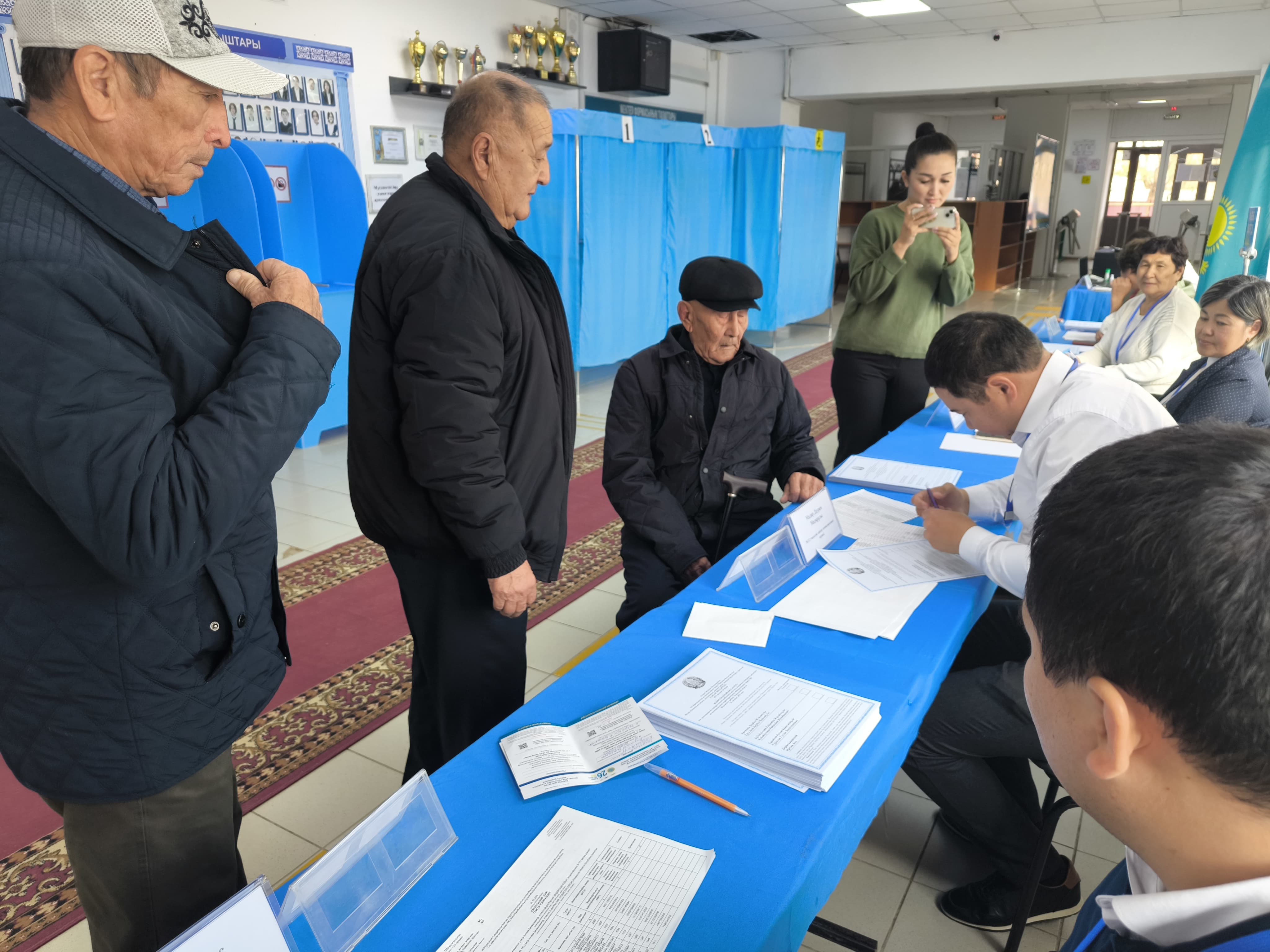 Соның бірі 90-дағы еңбек ардагері Меңдігерей Мүкиев көршілерімен бірге келіп, дауыс берді.