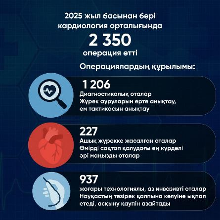 - 1 206 жағдай – диагностикалық операциялар. Бұл бағыттағы араласулар жүрек ауруларын ерте кезеңде анықтап, әрі қарайғы емдеудің нақты тактикасын таңдауға мүмкіндік береді.