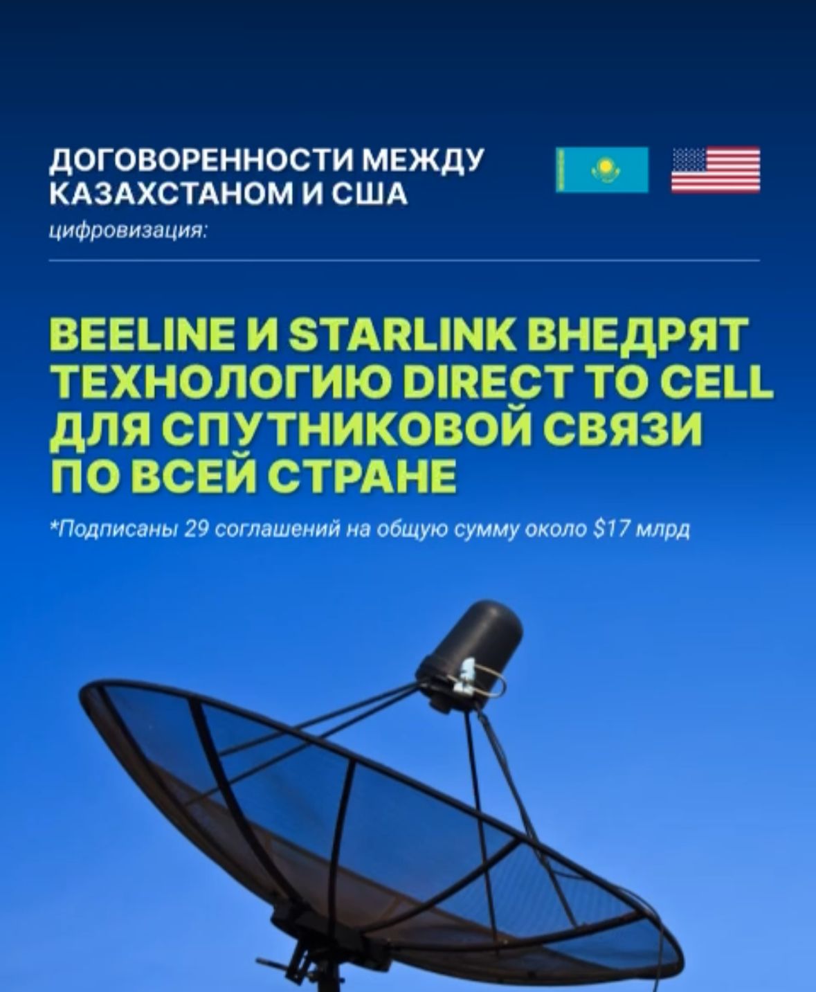 Қазақстан Республикасының Жасанды интеллект және цифрлық даму министрлігі, Beeline Қазақстан және Starlink компаниялары Direct to Cell технологиясын енгізу жөнінде өзара түсіністік туралы меморандумға қол қойды.