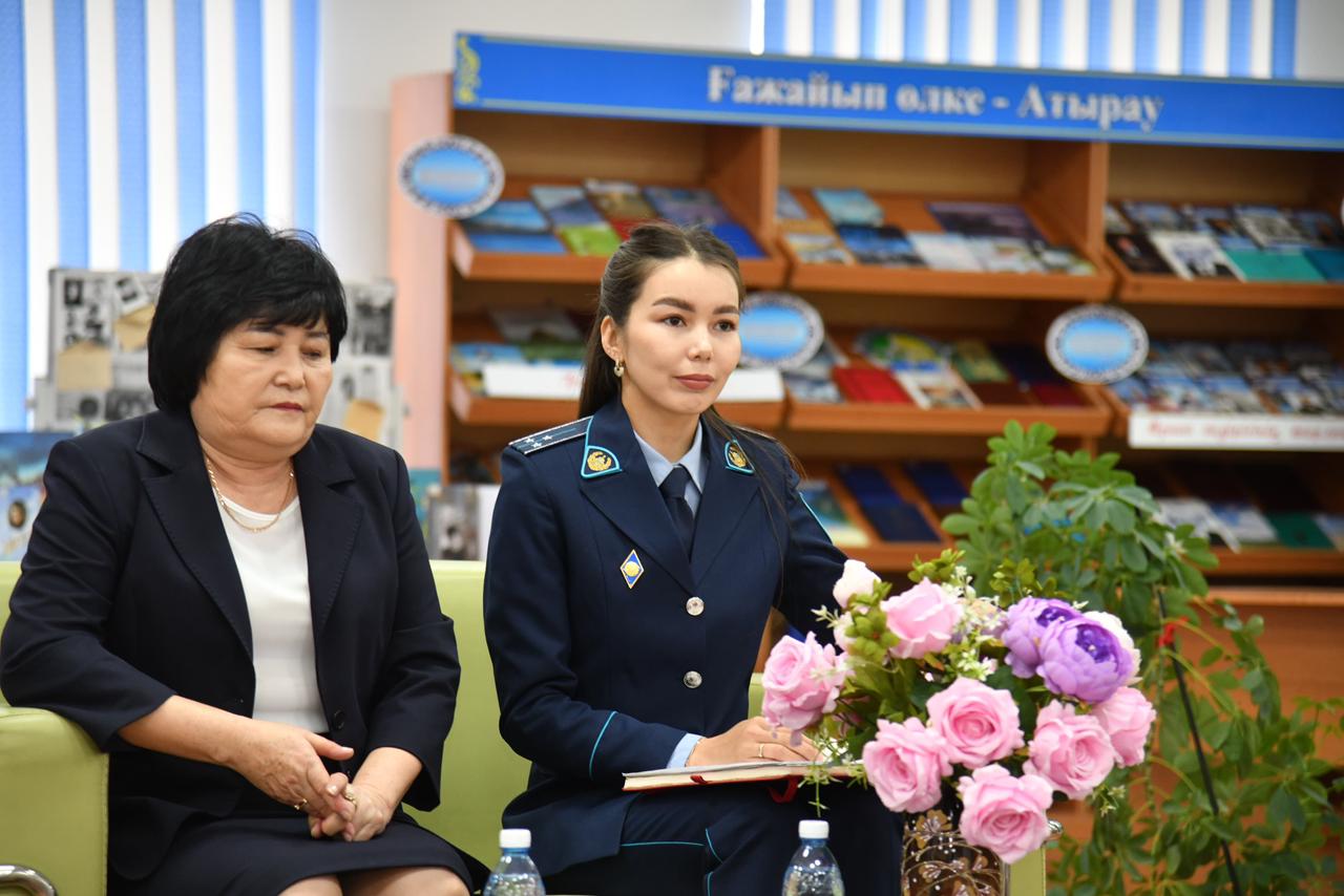 Іс-шараға Атырау облысы Полиция департаментінің Қоғамдық қауіпсіздік басқармасының инспекторы, полиция аға лейтенанты Дюсеғалиева Ботакөз Мақсотқызы арнайы шақырылды. Қонақ оқырмандарға заңның қоғамдағы негізгі рөлі, тәртіптің маңыздылығы, құқықтық жауапкершілік және қауіпсіздік мәдениеті туралы кеңінен әңгімелеп, бейнеролик пен слайд түрінде қосымша материалдар ұсынып, түсіндіру жұмысын жүргізді. Балалар өздерін қызықтырған сұрақтарын қойып, толық әрі мазмұнды жауаптар алды.