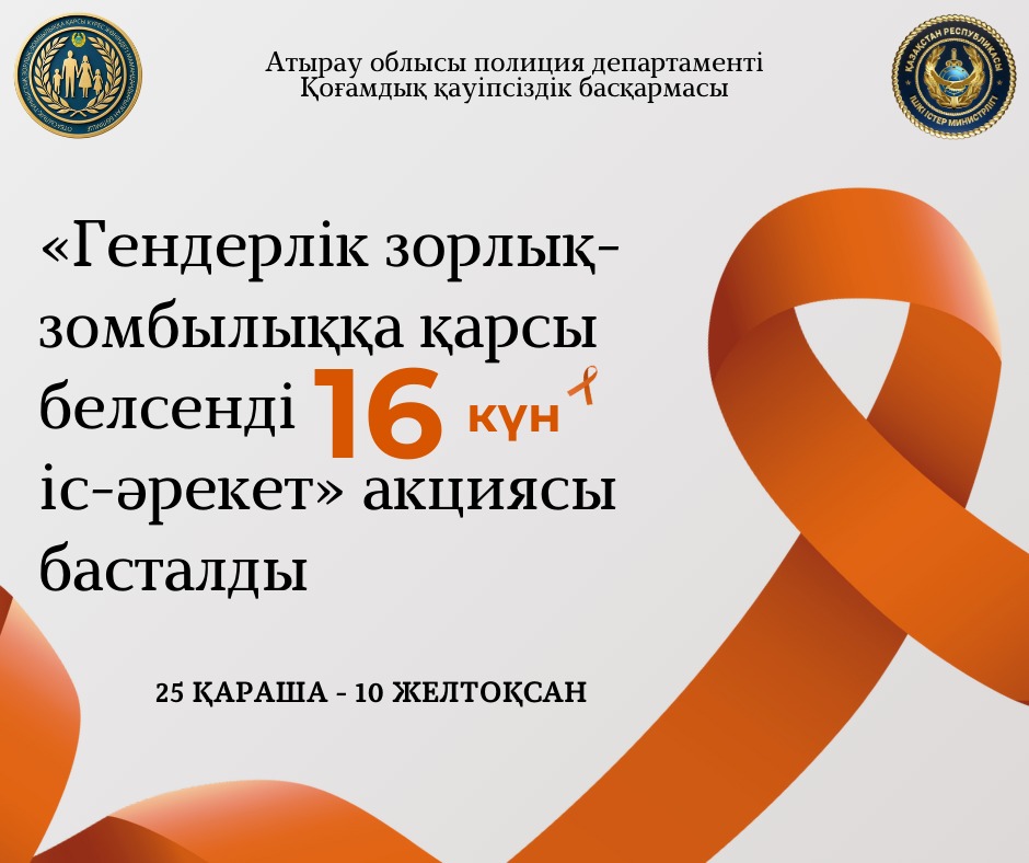 25 қараша мен 10 желтоқсан аралығында Қазақстан көлемінде «Гендерлік зорлық-зомбылыққа қарсы белсенді 16 күн іс-әрекет» акциясы ұйымдастырылады, — деп хабарлайды Атырау облыстық полиция департаментінің баспаөз қызметі.
