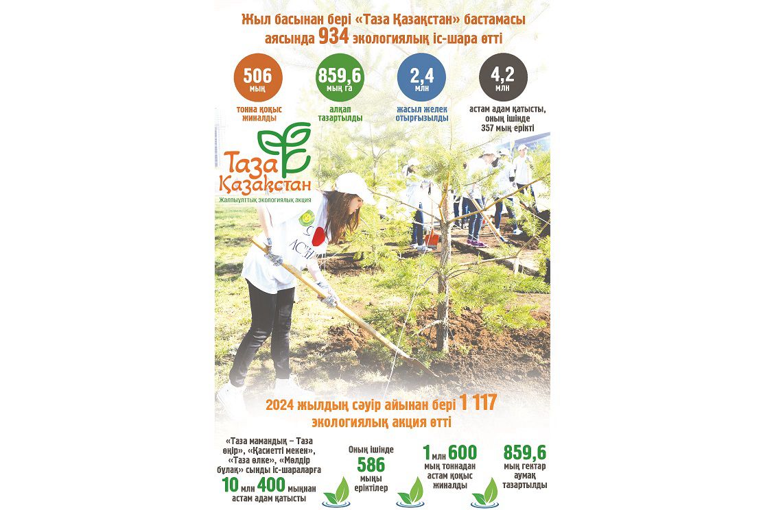 Осы орайда өткен жылдан бері ел көлемінде көптеген іс-шара қолға алынып, аталған акция шын мәнінде жалпыұлттық сипатқа ие болды. Экологиялық мәдениетті дамыту тұжырымдамасында бірнеше жылдық жоба-жоспар бекітілген соң күтетін нәтижелер де ауқымды. Мысалы, 2029 жылға қарай коммуналдық қалдықтарды қайта өңдеу ісін 25%-дан 38%-ға дейін арттыру көзделген. Экологиялық тәрбиені нығайту іс-шараларына тартылған оқушылар үлесін 15%-дан 40%-ға дейін ұлғайту жоспарланған. Сол секілді азаматтардың экологиялық өмір сапасына қанағаттану деңгейін 55,8%-дан 64,7%-ға дейін жоғарылату мақсаты тұр. Осы аралықта қоғамдық орындарда коммуналдық қалдықтарды бөлек жинайтын жәшіктер орнатуға басымдық беріледі. Осылайша, экологиялық қауіпсіз тәжірибелерді енгізіп, қоршаған ортаны ластауға «нөлдік төзімділік» мәдениетін қалыптастыру көзделген. Тұжырымдама шеңберінде былтыр және биыл ұйымдастырылған экологиялық іс-шаралардың саны мыңнан асты. Демек Мемлекет басшысы айтқандай, тазалыққа шақырған үндеу уақытша науқан деңгейінде қалып қойған жоқ, көпшіліктен кеңінен қолдау тапты.