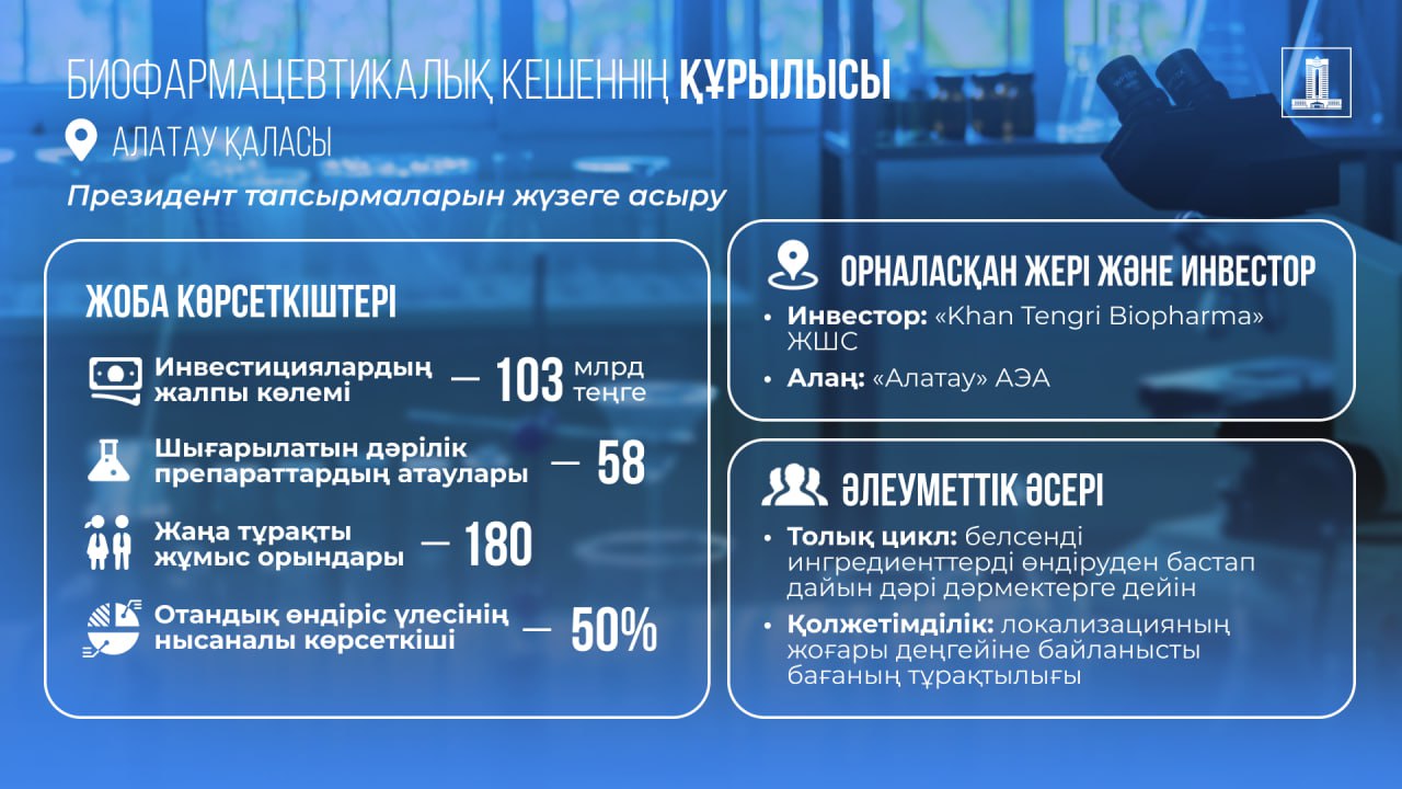 ⚙️ Нысан дәрілік заттар өндірісінің озық технологияларымен жабдықталады деп жоспарлануда. Негізгі мақсат – 58 препарат түрін шығаратын өндіріс қуатын құру. Толық циклді іске қосуға, оның ішінде белсенді фармацевтикалық ингредиенттер өндіруге ерекше назар аударылады.