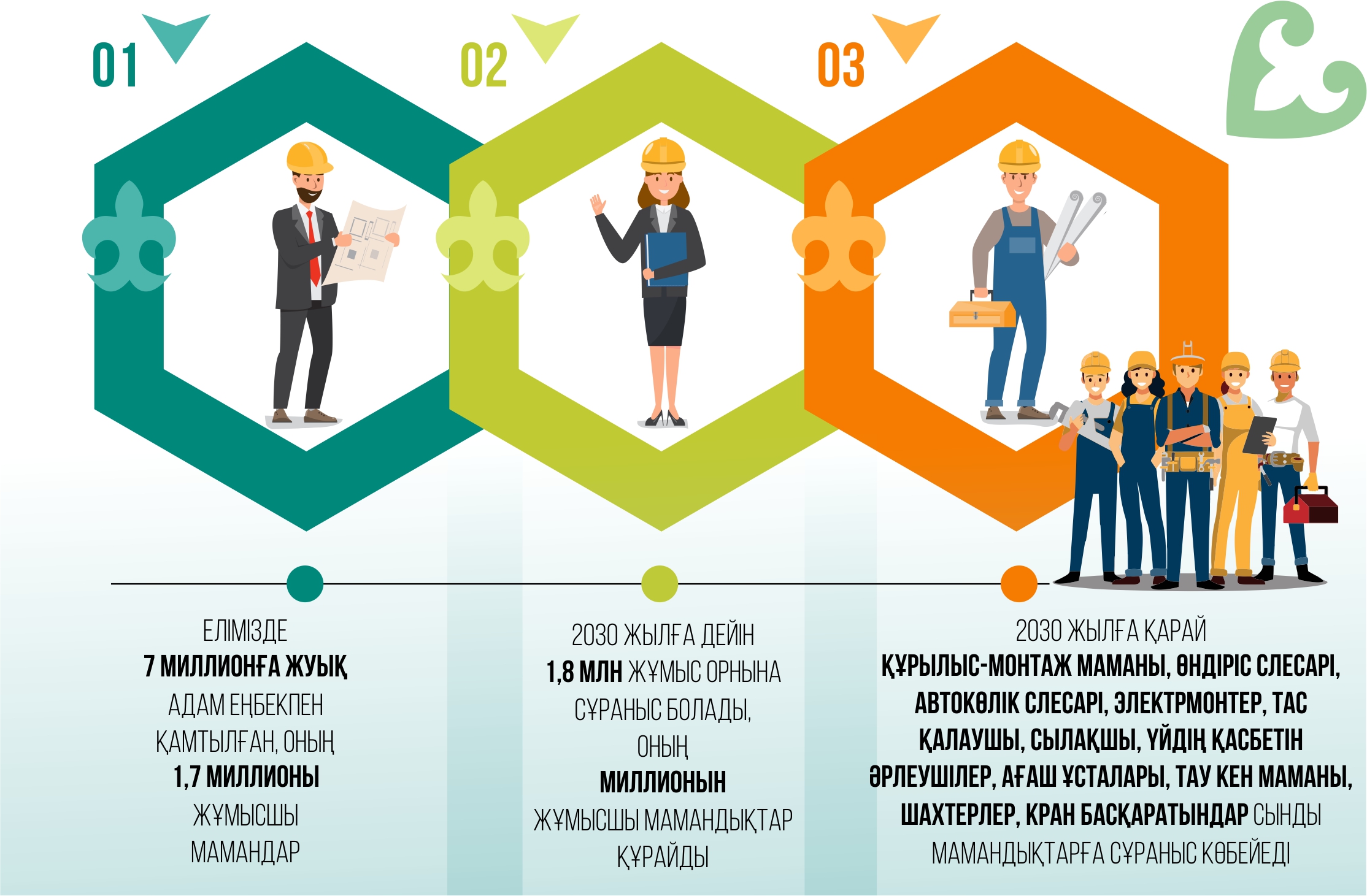 Шалқар Байқұлақов: Негізі біздің экономика әлемдік өлшеммен алғанда соншалықты күрделі емес. Ал мұндай экономика үрдісінде жұмысшы мамандар сұраныста болып отыр. Жалпы, еңбек нарығын жұмысшы мамандарсыз елестету мүмкін емес. Сол себепті біз ұсынған кешенді жоспарда келешекте жұмысшыға сұраныс көбейетінін айттық. Мысалы, болжам бойынша 2030 жылға дейін 1,8 млн жұмыс орнына сұраныс болады. Оның миллионын жұмысшы мамандық құрайды. Мұнда сауда, құрылыс, көлік, ауыл шаруашылығы, өңдеу өнеркәсібі, тау-кен өнеркәсібі сынды салаларға сұраныс артады. Бүгінде елде 7 миллионға жуық адам еңбекпен қамтылған болса, соның 1,7 миллионы – жұмысшы мамандар. Еліміздегі әрбір төртінші адам жұмысшы. Яғни жұмысшыға сұраныс қазірдің өзінде көп. 2030 жылға қарай жұмысшы мамандықтардың ішінде дәнекерлеушіге сұраныс жоғары болады. Сол секілді сантехник, тракторшы, құрылыс-монтаж маманы, өндіріс слесарі, автокөлік слесарі, электрмонтер, тас қалаушы, сылақшы, үйдің қасбетін әрлеушілер, ағаш ұсталары, тау кен маманы, шахтерлер, кран басқаратындар сынды мамандықтарға сұраныс көбейеді.