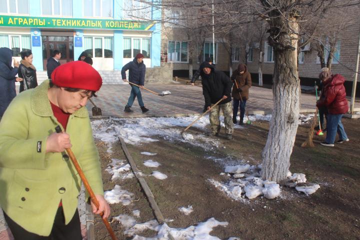 Аталған кәсіптік-техникалық білім ұясының директоры, партия мүшесі, аудандық мәслихаттың депутаты Болатбек Өтегенов: – Бүгін «Amanat» партиясының  аудандық филиалымен бірге «Таза Қазақстан» акциясы аясында бейсенбілік сенбілік өткізгелі тұрмыз. Оған партияның  аудандық филиалының өкілі  Балағазы Иманғалиев қатысып отыр. Ауламызды, колледж айналасын тазарту жұмыстарын жасаймыз. Ауылымыздың тазалығы әрбір үйдің, көшенің, мекеменің тазалығынан басталады,– деп сәттілік тілеп, ортақ шаруаға өзі де атсалысты. Жастар, сабақ өткізуден бос ұстаздар, ұжым мүшелері акцияға ұйымшылдықпен қатысты.